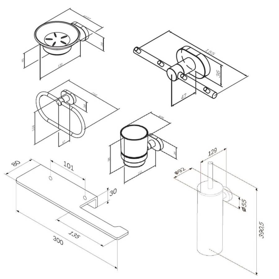 Занимая минимум места в пространстве аксессуары Sense L помогут рационально организовать место для хранения и станут стильными акцентами в интерьере. В комплекте: стеклянная мыльница стеклянный стакан набор крючков для полотенец кольцо для полотенец держатель для туалетной бумаги с полкой стойка с туалетной щеткой._x000D_
