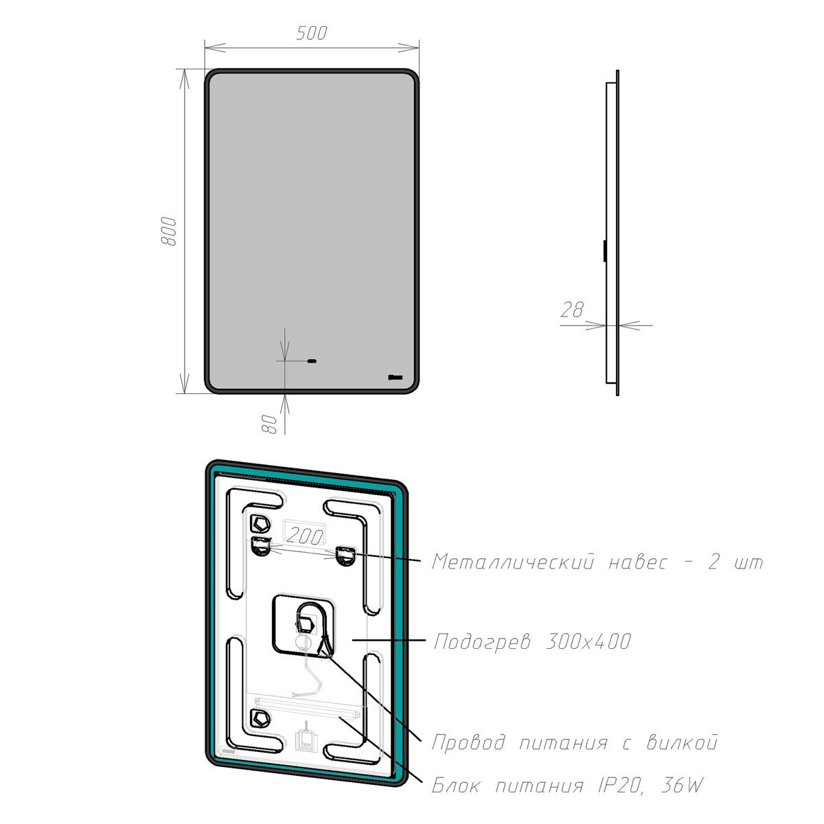 •LED-подсветка по контуру, холодный свет;