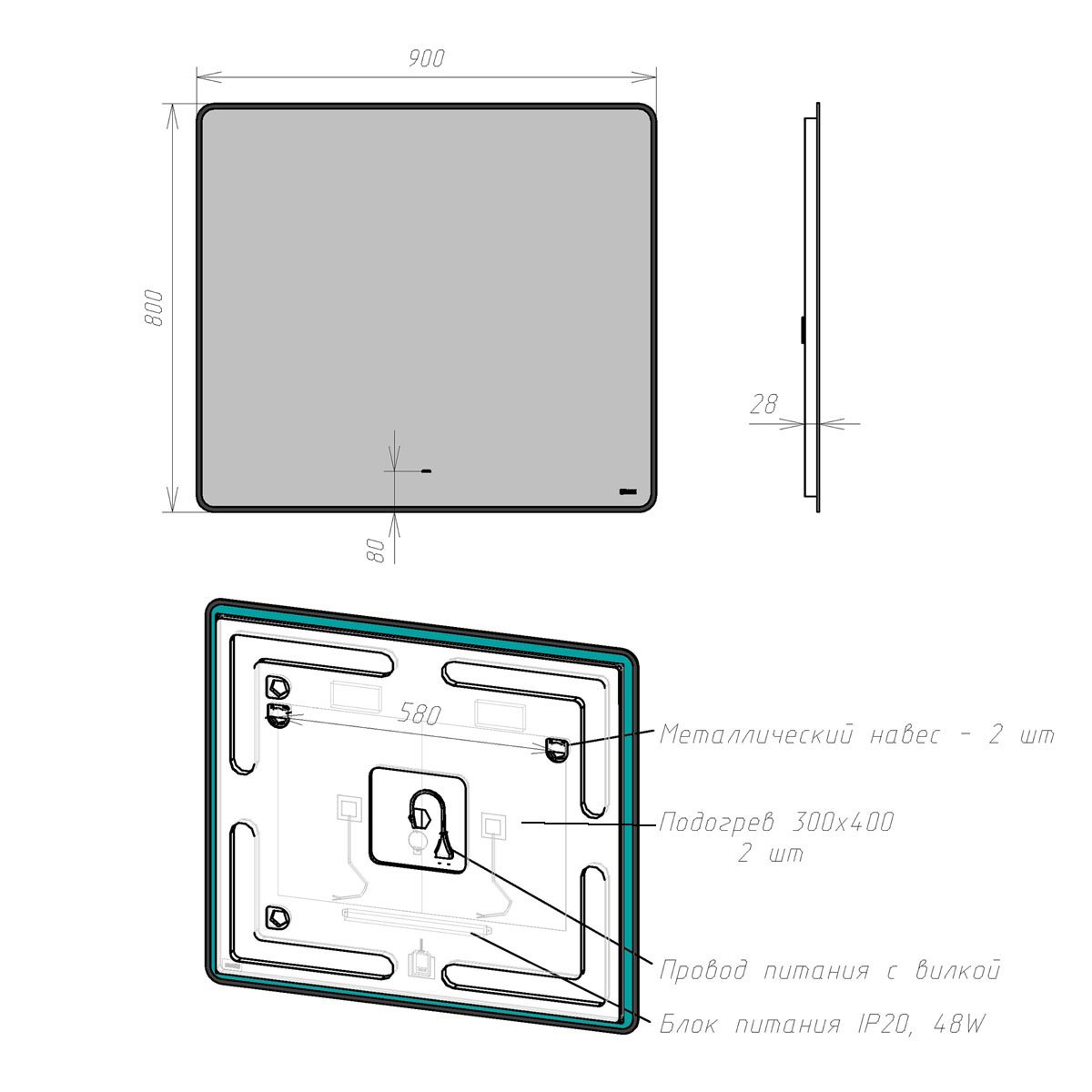 •LED-подсветка по контуру, холодный свет;