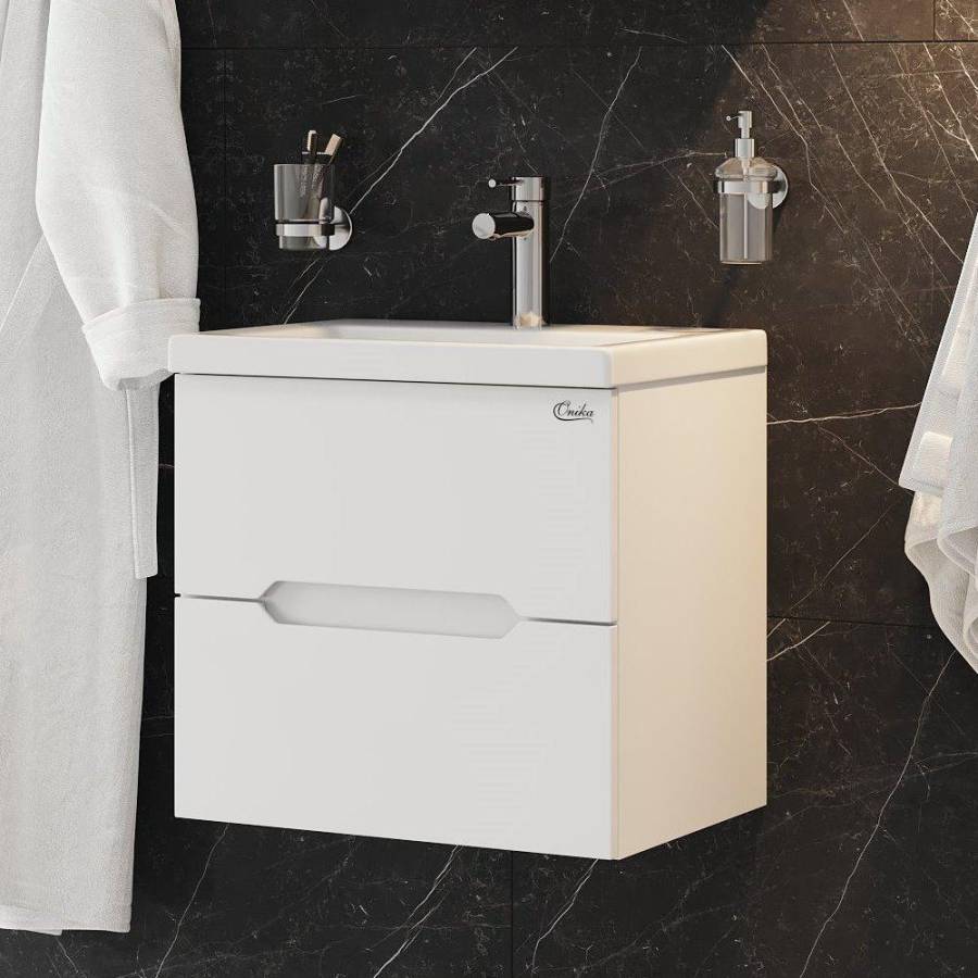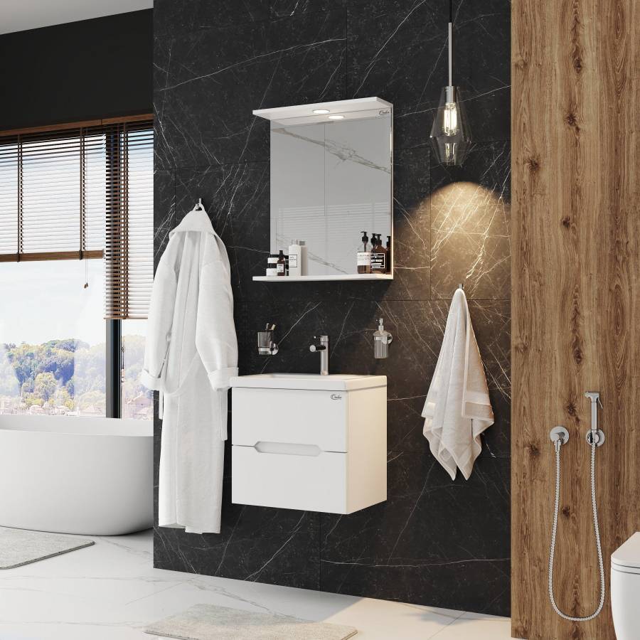 Корпус тумбы выполнен из ЛДСП, фасады ящиков - из ЛМДФ в пленке, устойчивых к механическим воздействиям, перепадам температур и высокой влажности. Тумба надежно крепится к стене и не занимает место на полу, не создавая при этом сложностей в уборке ванной комнаты.
