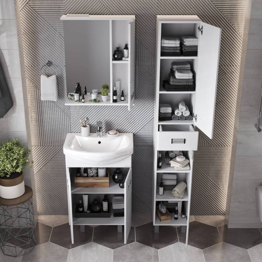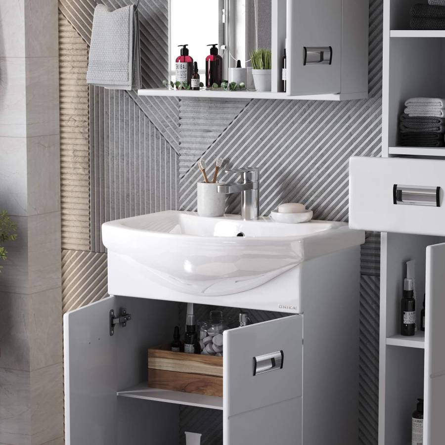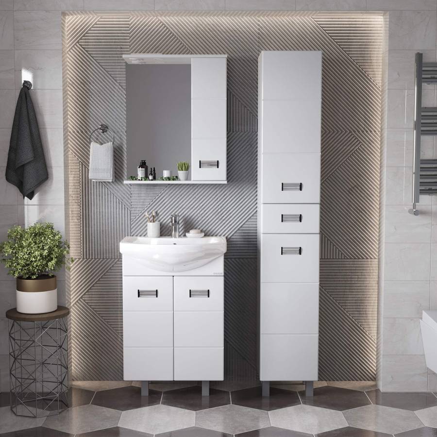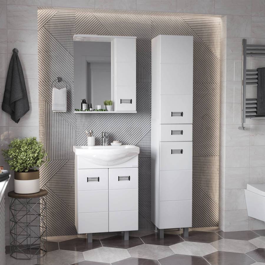 Глянцевый белый цвет фасада, ненавязчивая горизонтальная фрезеровка, врезные хромированные ручки и аккуратная лаконичность - все это позволяет коллекции Балтика стать центральным звеном интерьера ванной комнаты.