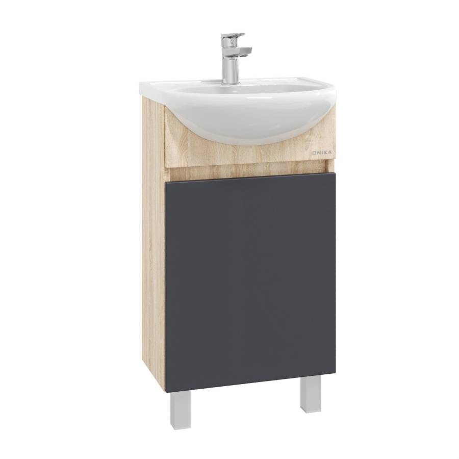 Тумба сочетает в себе красоту и функциональность: серый матовый фасад с покрытием SoftTouch, корпус цвета дуб сонома с роскошной текстурой, строгие формы без декора. За дверцей с интегрированной ручкой скрывается пространство с полкой для размещения необходимых бытовых принадлежностей.