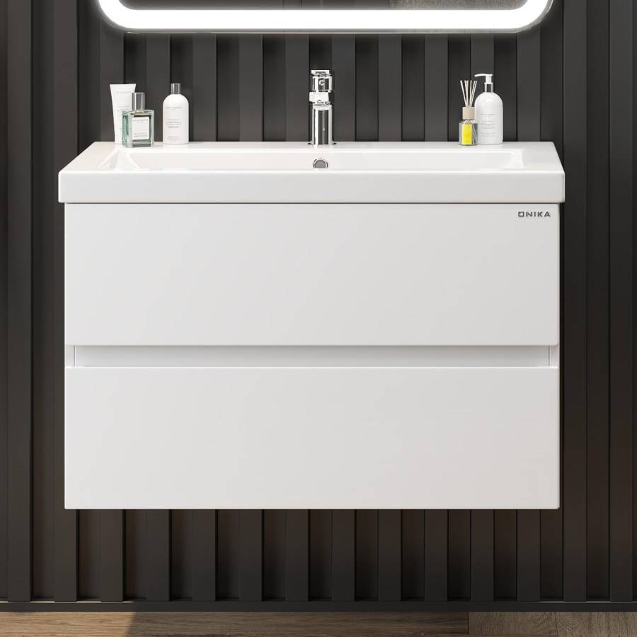 Подвесная конструкция значительно упрощает процесс уборки в ванной комнате, а ручки, изящно интегрированные в фасады, позволяют сделать эксплуатацию более удобной и практичной.