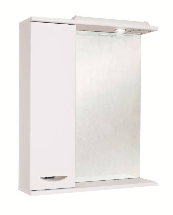 Слева от зеркала за распашной дверцей с механизмом плавного закрывания расположено отделение для хранения, под зеркалом - открытая полочка для косметических средств или декоративных элементов.