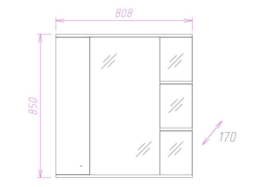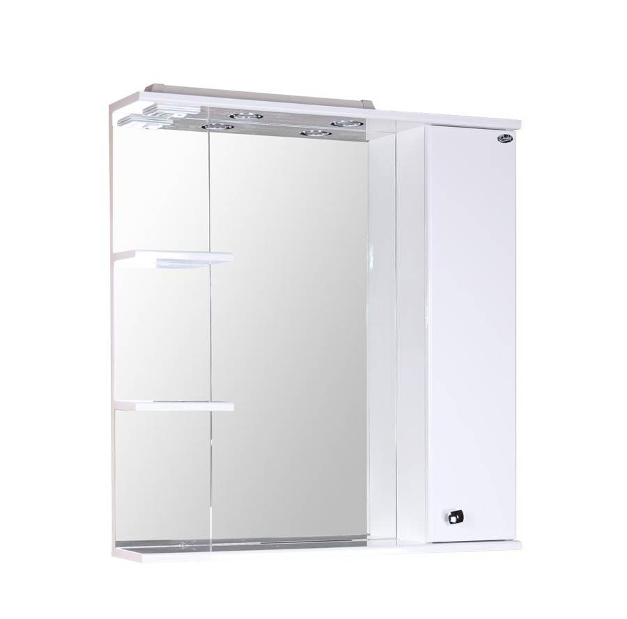 Современный функционал шкафа позволяет удобно расположить все необходимое: справа от зеркала за распашной дверцей с механизмом плавного закрывания расположено отделение для хранения, разделенное на три части горизонтальными полочками, слева и внизу под зеркалом - открытые полочки для косметических средств или декоративных элементов.
