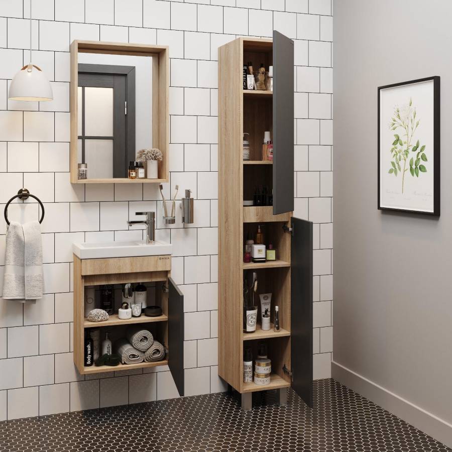 Корпус пенала выполнен из ЛДСП, фасад - из МДФ в пленке, специально предназначенных для использования в условиях высокой влажности.