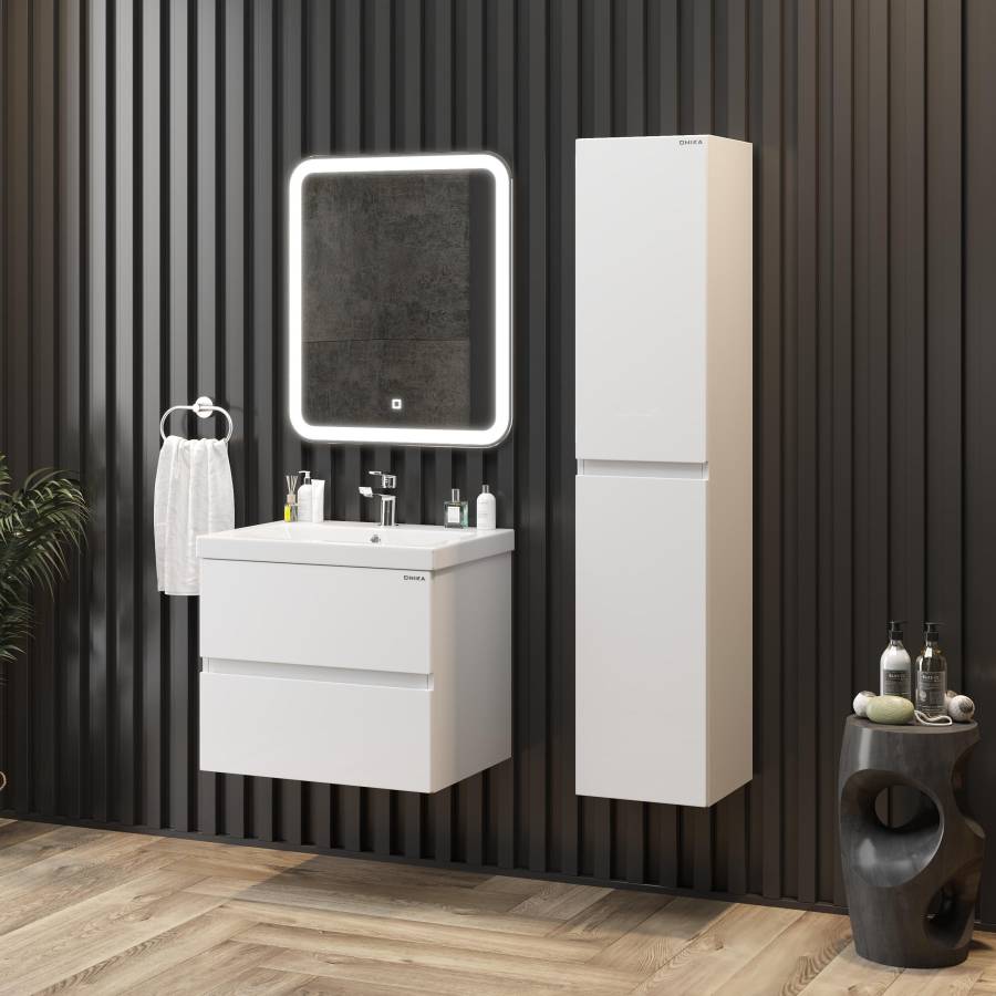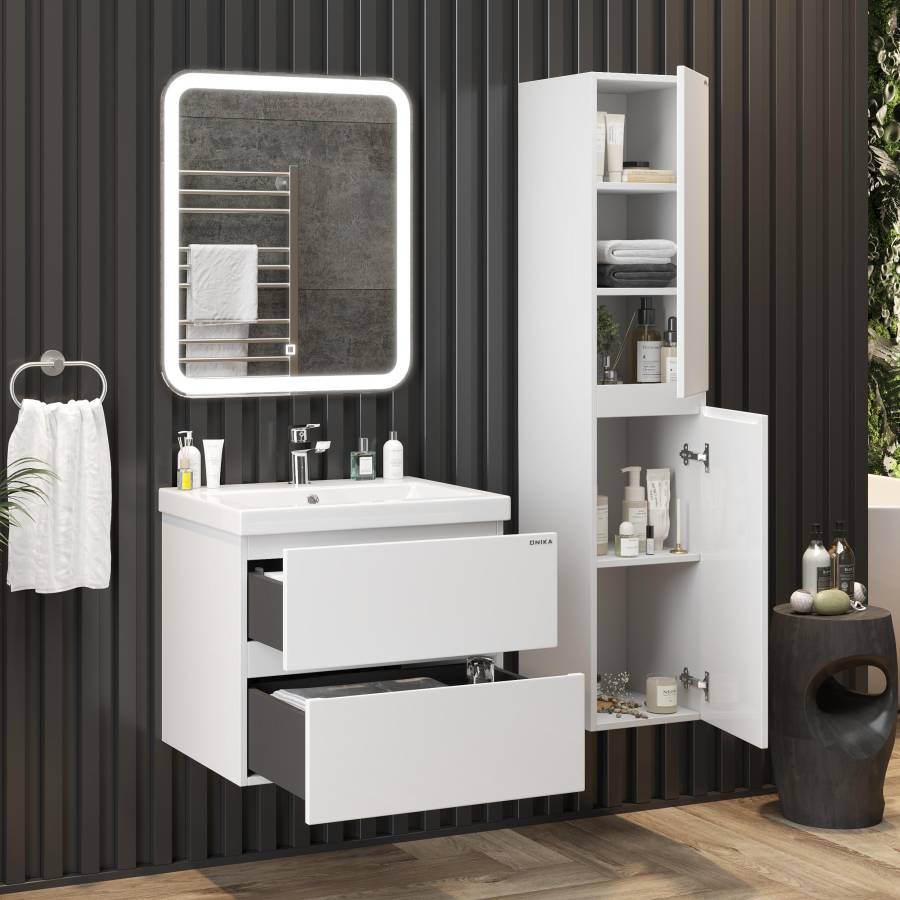 Внутреннее пространство пенала поделено полками на 5 секций разной высоты, что позволяет разместить различные косметические средства. Дверь снабжена механизмом плавного закрывания.