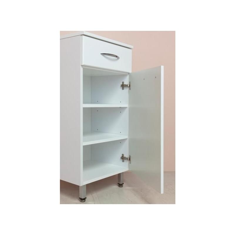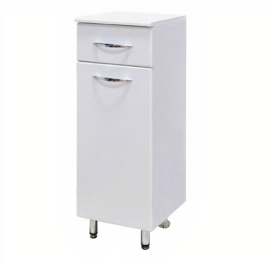 Оптимальная высота пенала позволяет использовать его поверхность как дополнительную столешницу, небольшой удобный ящик с направляющими полного выдвижения подойдет для хранения мелких аксессуаров, а распашная дверца скрывает вместительное внутреннее пространство с двумя регулируемыми по высоте полочками, на которой можно компактно разместить бытовые принадлежности.