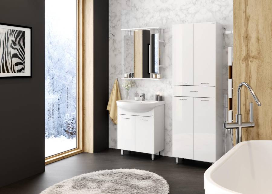 Белая глянцевая поверхность, простые узкие ручки, отсутствие декора, лаконичная форма и минималистичный дизайн подойдет к любому интерьеру.
