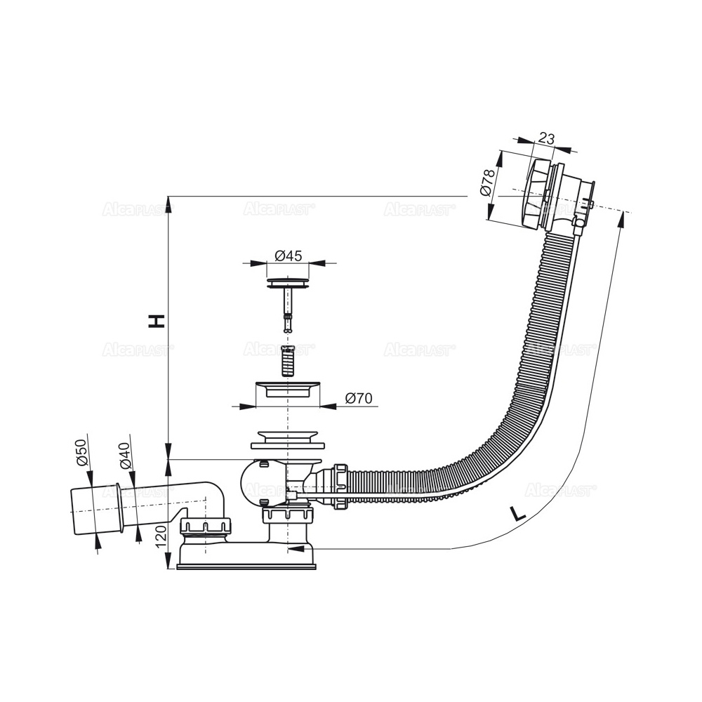 Корпус сифона с системой перелива; Поворотная стальная накладка, хромированная; Хромированная стальная пробка; Хромированная решетка слива из нержавеющей стали; Гидрозатвор сифона из полипропилена, сваренный ультразвуковым методом, устойчив к термическим и химическим воздействиям; Монтажный набор; Профильное уплотнение. |