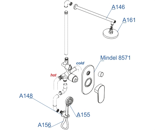 Смеситель для ванны и душа Mindel 8571, Подключение шланга A148, Шланг для душа 1500 мм A156, Верхняя душевая насадка A161, Настенный верхний излив для душа A146, Лейка 3-функциональная A155 |