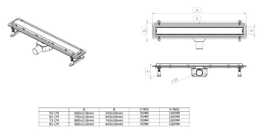 Лоток из ABS-пластика;Штампованная решетка из нержавеющей стали двухсторонняя;Сухой затвор для защиты от неприятного запаха из системы канализации;Грязеулавливающая сетка;Гидроизоляционная лента;Сифон поворотный с гидрозатвором, горизонтальный выпуск DN50;Ножки для регулировки высоты с комплектом для установки;Ключ для снятия решетки |