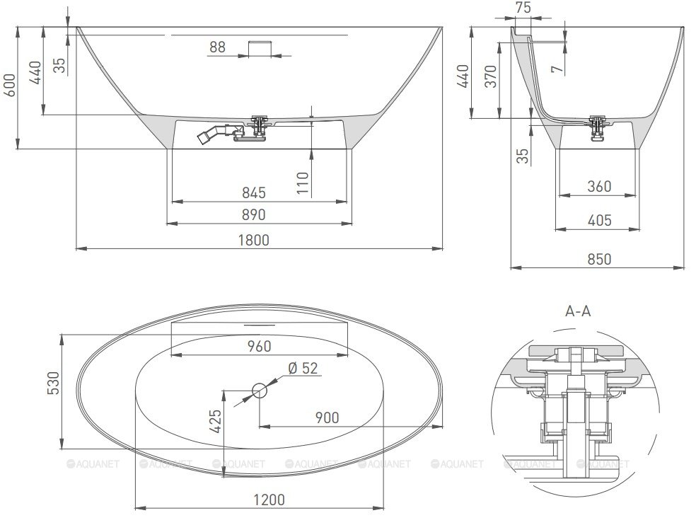 В ванной DIVA прямое длинное и широкое дно 120 см на 53 см, вверху ширина чаши — 85 см. Это делает ванну удобной для того, чтобы принимать её вдвоём.