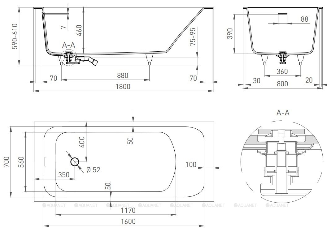 Ванна, регулируемые ножки до 2 см, интегрироВанный слив перелив, донный клапан цвет белый |