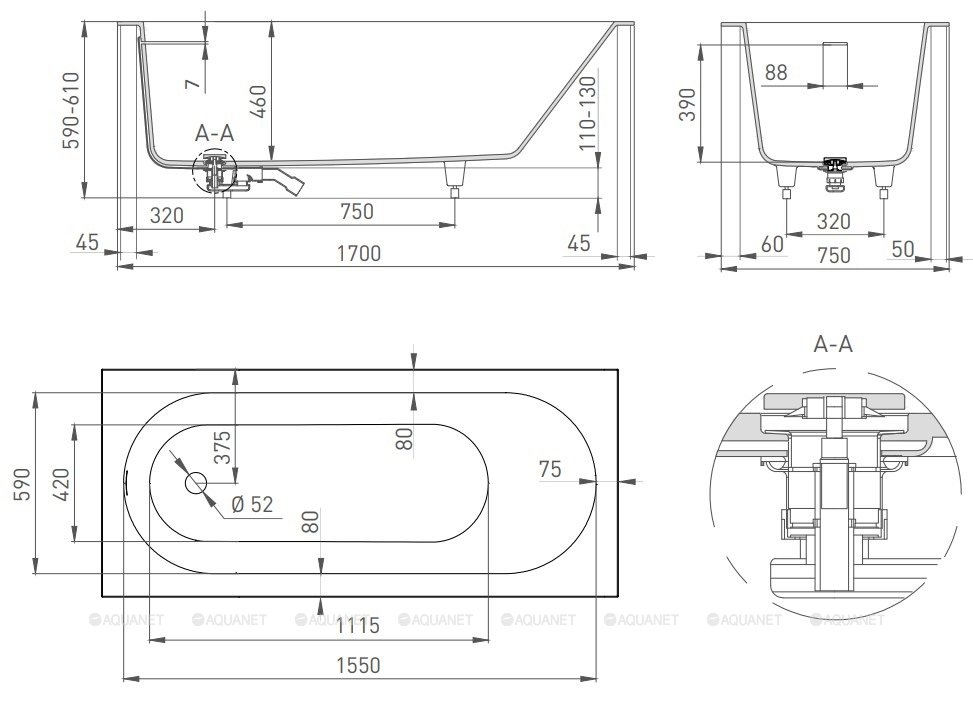 Ванна, регулируемые ножки до 2 см, интегрироВанный слив перелив, донный клапан цвет белый |