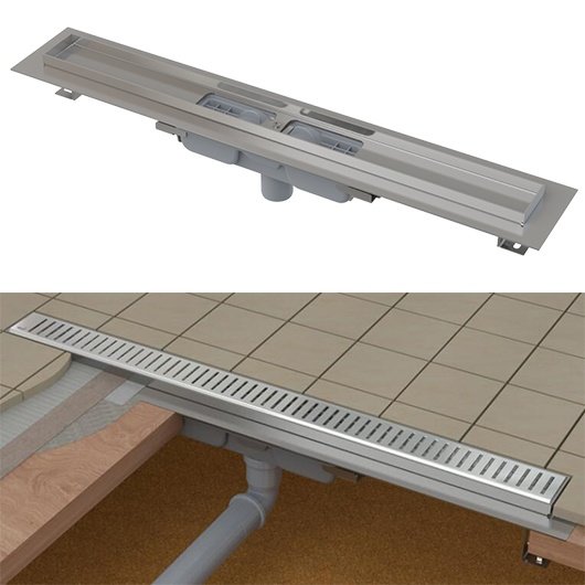 Водоотводящий желоб с сифоном; Монтажный комплект: шуруп Ø6×50 – 2 шт., дюбель Ø10 – 2 шт.; Самоклеящиеся гидроизоляционные ленты; Защитная пленка для воротника; Защитная пленка на вход в сифон; Монтажная крышка желоба - полистирол. |