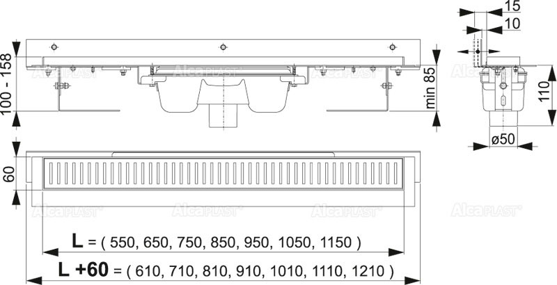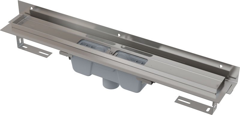 Водоотводящий желоб с сифоном Монтажный набор: шуруп Ø6×50 – 2 шт., дюбель Ø10 – 2 шт., шуруп Ø4,2×38 – 2 шт.,дюбель Ø8 – 3 шт. Самоклеящиеся гидроизоляционные ленты Защитная пленка для воротника желоба и впускного отверстия сифона Монтажный вкладыш для защиты лотка желоба Монтажный набор для крепления регулируемых ножек: шуруп M6×12 – 2 шт. |