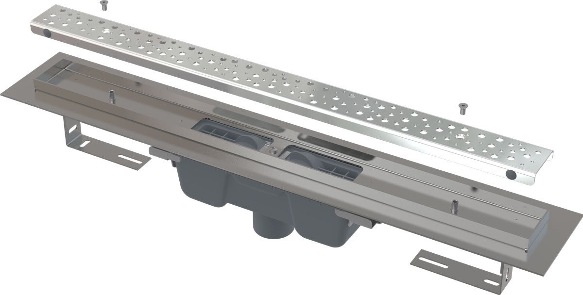Водоотводящий желоб с сифоном Монтажный набор: шуруп Ø6×50 – 2 шт., дюбель Ø10 – 2 шт. Самоклеящиеся гидроизоляционные ленты Защитная пленка для воротника желоба и впускного отверстия сифона Монтажный вкладыш для защиты лотка желоба Перфорированная решетка BUBLE из нержавеющей стали Монтажный набор для крепления регулируемых ножек: шуруп M6×12 – 2 шт. Монтажный набор для закрепления решетки: болт M5×10 – 2 шт. |