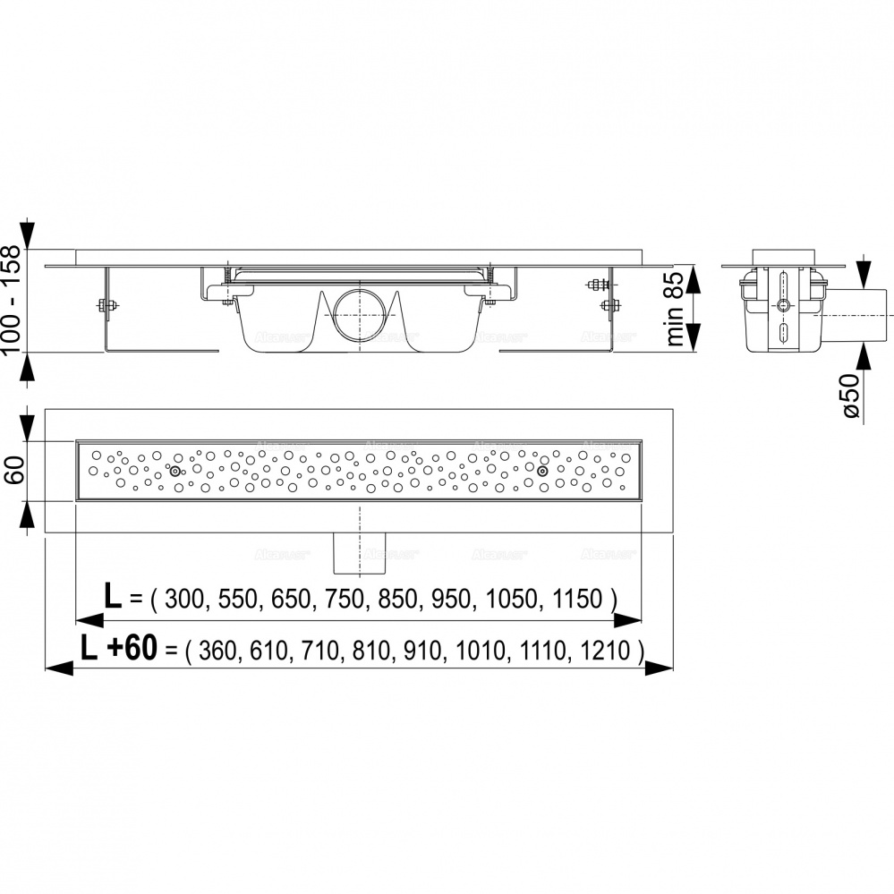 Водоотводящий желоб с сифоном Монтажный комплект: шуруп Ø6×50 – 2 шт., дюбель Ø10 – 2 шт. Самоклеящиеся гидроизоляционные ленты Защитная пленка для воротника Монтажная крышка желоба – полистирол Перфорированная решетка BUBLE из нержавеющей стали |