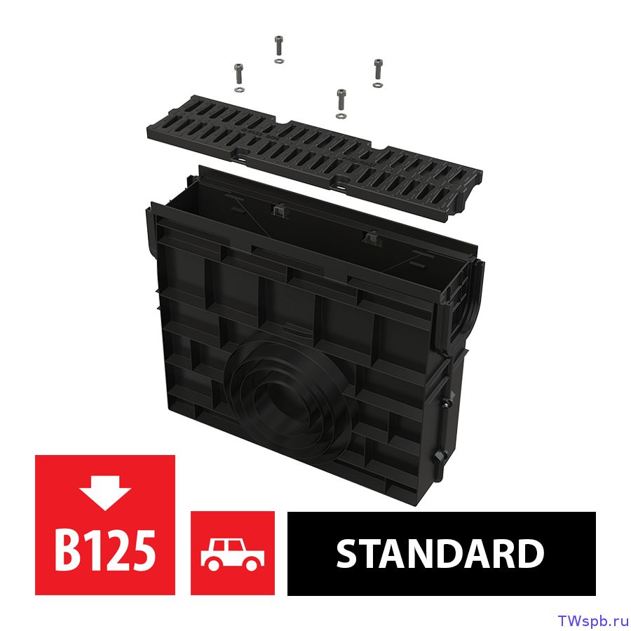 Корпус желоба с пластиковой рамой Композитная решетка – 2×0,5 м – класс нагрузки B125 Болты для крепления решетки в канале – 8 шт. |