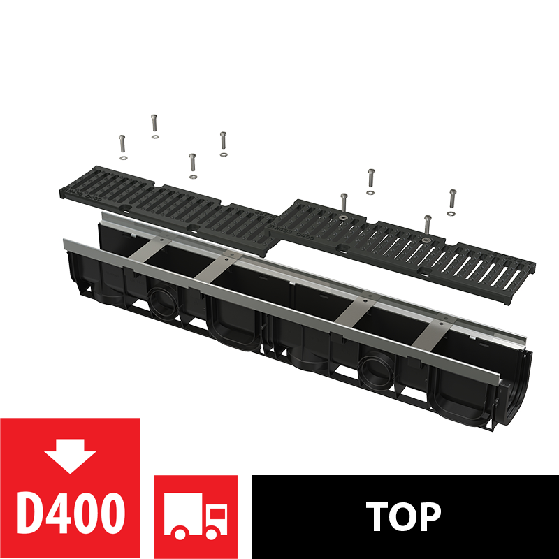 Корпус желоба с металлической рамой Установочные распорки – 4 шт. Чугунная решетка – 2×0,5 м – класс нагрузки D400 Болты для крепления решетки в канале – 8 шт. |