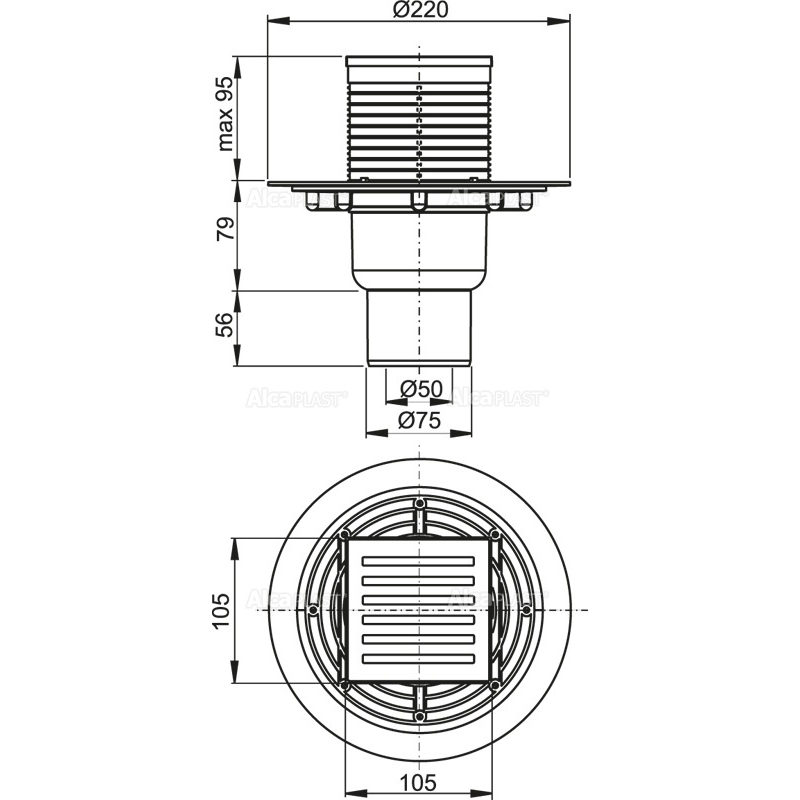 AlcaPlast APV203 Душевой трап | комплект с дизайн-решёткой 105*105 мм (нержавеющая сталь). Для ванных комнат и других помещений, где предполагается частый и регулярный сток воды в сливной трап. Для водоотведения на уровне пола. Для безбарьерного доступа. Массивная латунная решетка 102×102×4 мм. Регулируемая по высоте горловина 9–95 мм. Широкий изоляционный воротник для удобного монтажа укладочной гидроизоляции пола. Прямое подключение к канализационному стоку Ø50/75 мм. Вручную легко чистящийся сифон, вплоть до сточной трубы. Мокрый гидрозатвор надежно защищает от проникновения запаха из канализации. Совместимость с другими составными частями сливного трапа, включительно мокрого, сухого и комбинированного гидрозатвора SMART. Материал: полипропилен, устойчивый к механическим, химическим и термическим повреждениям. Материал: нержавеющая сталь AISI 304, DIN 1.4301