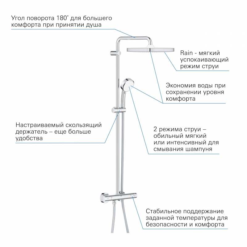 Душ верхний (26685000 GROHE);душ ручной (27571002 GROHE);душевой шланг (28410001 GROHE);термостат; |