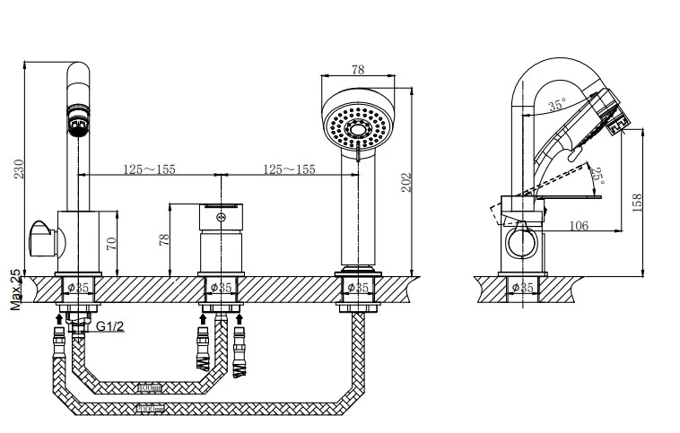 В смеситель установлен картридж D-35 с керамическими пластинами, а также дивертор с керамическими пластинами. Пластиковый аэратор с нержавеющим корпусом. Высота смесителя 230мм, угол наклона аэратора 35гр, высота излива до аэратора 106мм.