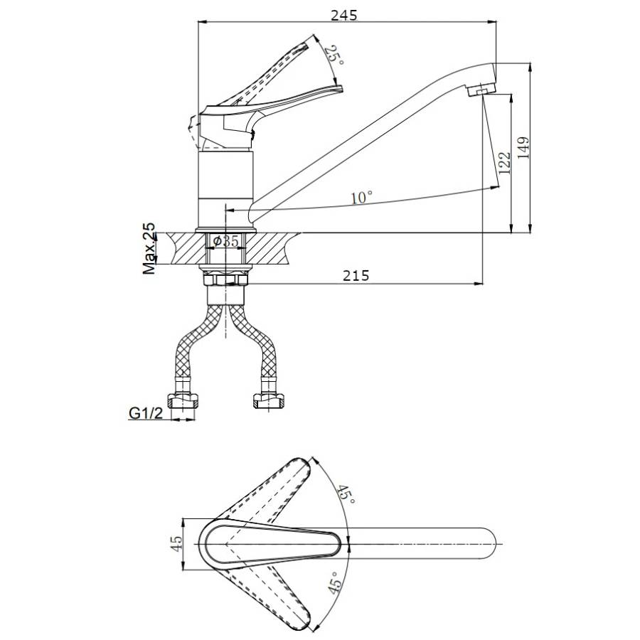 В смеситель установлен картридж D-35 с керамическими пластинами. Высота смесителя 149 мм. Излив поворотный 215 мм. Высота излива до аэратора 122 мм. Аэратор изготовлен из пластика с нержавеющим корпусом, угол наклона - 10 гр.