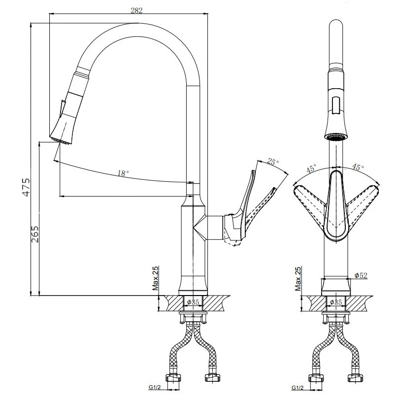 В смеситель установлен картридж D-35 с керамическими пластинами. Высота смесителя 486 мм. Излив поворотный 274 мм. Высота излива до аэратора 238 мм. Аэратор изготовлен из пластика с нержавеющим корпусом, угол наклона аэратора-18гр.