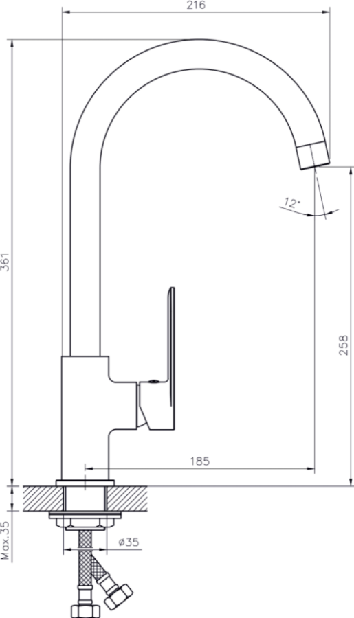 В смеситель установлен картридж D-35 с керамическими пластинами. Высота смесителя 361 мм. Излив поворотный, 185 мм. Высота излива до аэратора 258 мм. Аэратор изготовлен из пластика с нержавеющим корпусом, угол наклона аэратора- 12 гр.