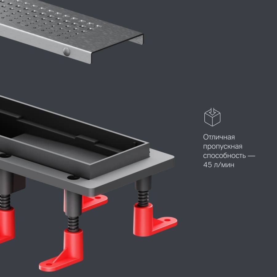 Продукт обладает низкой высотой монтажа и возможностью регулировки что предполагает экономию бюджета при заливке пола. Трап имеет инновационную конструкцию решетки с фильтром что значительно увеличивает межсервисный интервал._x000D_