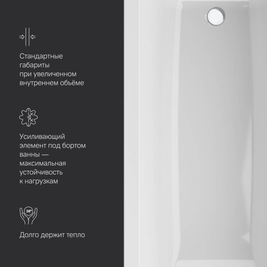 Удобная спинка и оптимальные размеры ванной гарантируют полное расслабление и хороший отдых. За счет низкой теплопроводности и теплоемкости акрила ванна поддерживает температуру набранной воды._x000D_