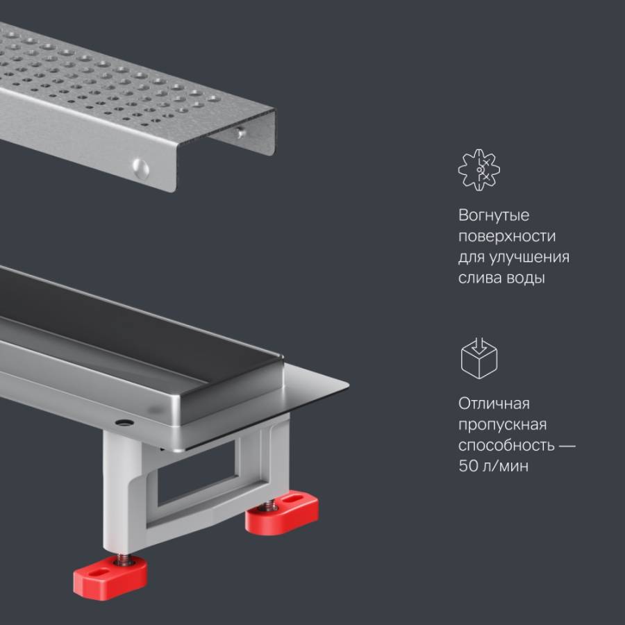 Продукт обладает низкой высотой монтажа и возможностью регулировки что предполагает экономию бюджета при заливке пола. Нержавеющая сталь со специальным антикоррозийным защитным покрытием нанесенная методом кислотной пассивации. Выход разработан на два диаметра: 40 и 50 мм которые выбираются в процессе монтажа._x000D_