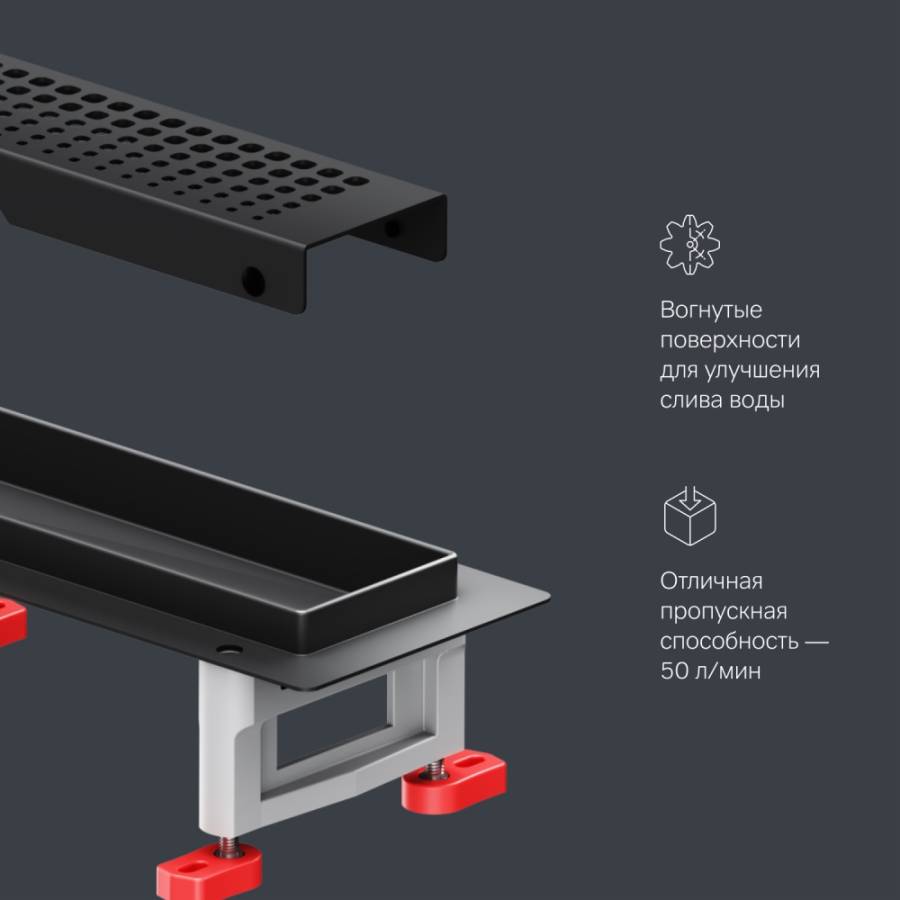 Продукт обладает низкой высотой монтажа и возможностью регулировки что предполагает экономию бюджета при заливке пола. Трап выполнен из высококачественной нержавеющей стали марки AISI 304. Выход разработан на два диаметра: 40 и 50 мм которые выбираются в процессе монтажа._x000D_