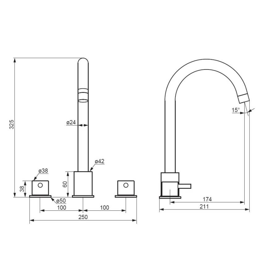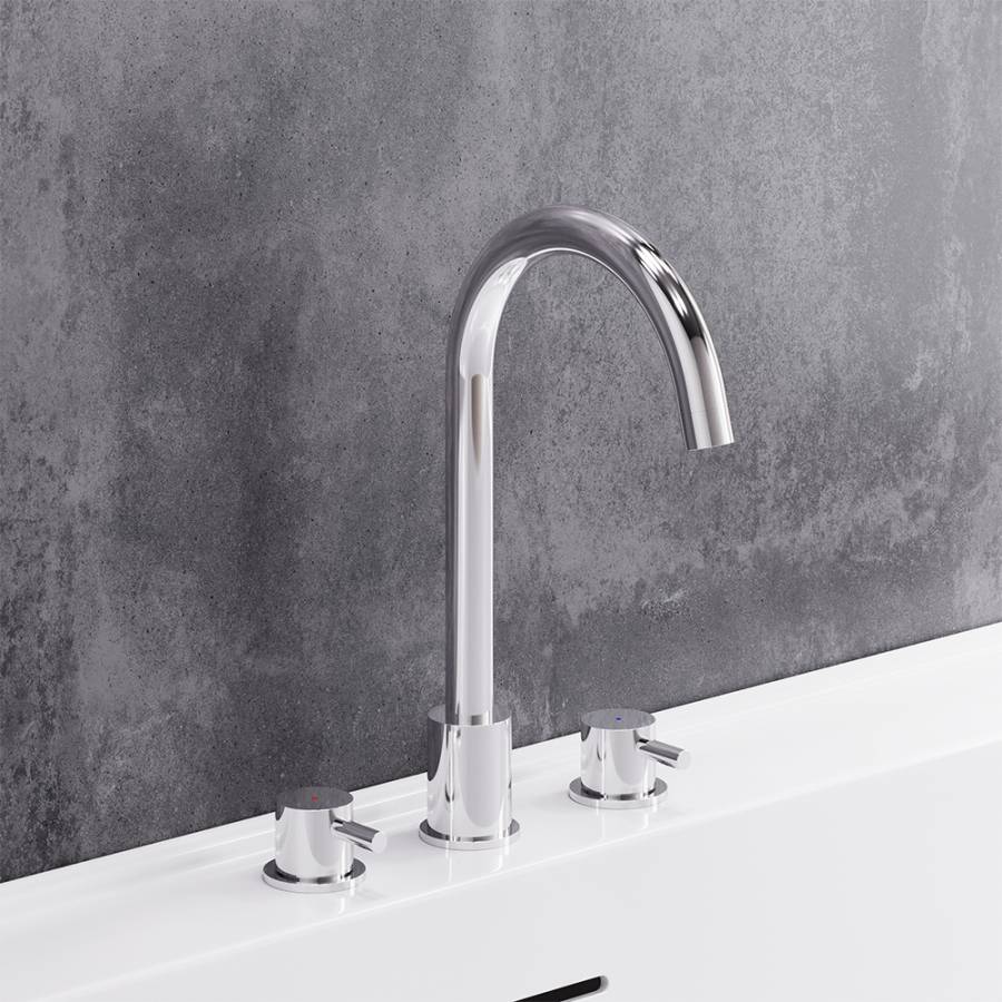 Смеситель для раковины состоит из трех секций: температура воды регулируется отдельными ручками независимо друг от друга как на ретро смесителях. Ручки в виде стика станут ярким акцентом и привнесут особую эстетику в интерьер ванной комнаты. _x000D_