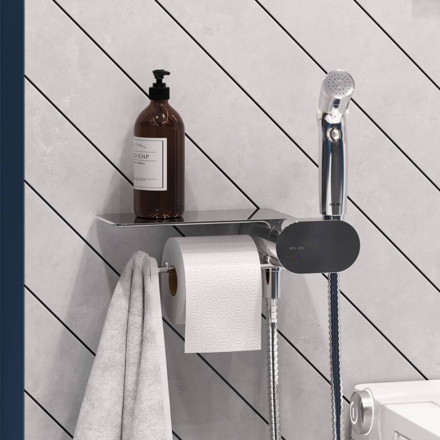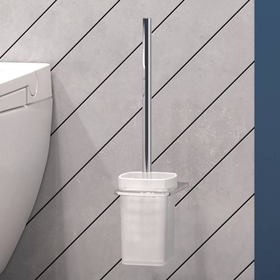 Завершает комплект подвесная cтойка с туалетной щеткой в стиле Hi-Tech. Продуманный дизайн и удивительные детали – отделение для хранения в держателе для туалетной бумаги. ""