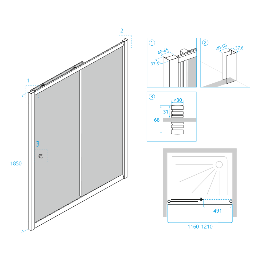Общая высота двери составляет 1850 мм, что позволяет использовать ее в стандартных ванных комнатах. Кроме того, для установки двери предусмотрен дополнительный профиль. Это позволяет регулировать ее размеры и подгонять под индивидуальные нужды.