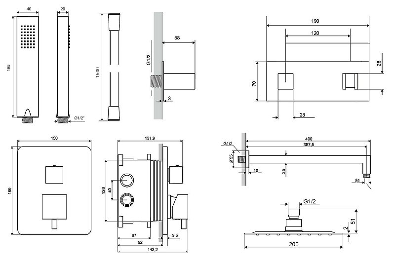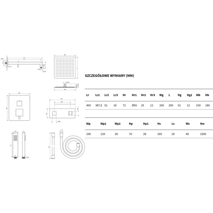 - верхний душ 20х20 см из нержавеющей стали;