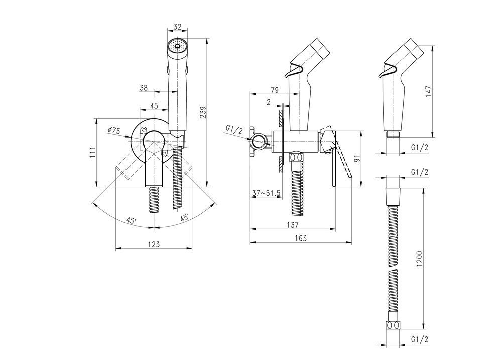 Рукоятка, лейка гигиенического душа, подключение для шланга, шланг в металлической оплетке 1/2" 120см, паспорт изделия с гарантийным талоном, инструкция по эксплуатации |